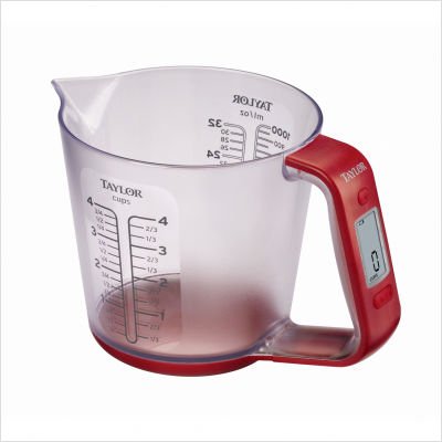 3890 Features: -Digital measuring cup. -With their unique blend of quality and stylish design, Salter products are as good to look at as they are to use. -Unique two in one measuring and weighing tool, the new Salter digital measuring cup digitally weighs food or liquids. -Both weight and volume can be measured and units can be converted to meet the needs of the recipe. -Auto zero, add and weight and auto shut off functions. -Preprogrammed specification to convert weight to volume: Volume conversion for water, milk, oil, sugar and flour. -Volume capacity: 1 liter. -Measures in milliliter, cups, fluid ounces, grams and pounds. -Plastic measuring cup with molded handle. Specifications: -Capacity: 4.4 lbs/2 kg. -Overall dimensions: 6.78'' H x 9.85'' W x 7'' D.
