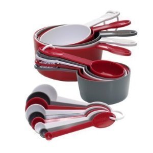 Product Features Comprehensive 19-piece kitchen measuring set in red, white and gray; standard and metric measurements Cup measurements: 1/8, 1/4, 1/3, 1/2, 2/3, 3/4, 1, 1-1/2, 1-3/4, and 2 cups Spoon measurements: 1/32 tsp, 1/16 tsp, 1/8 tsp, 1/4 tsp, 1/2 tsp, 1 tsp, 2 tsp, 1/2 Tbls, and 1 Tbls Large handles provide a more secure grip All pieces are dishwasher safe This 19-piece measuring set is a comprehensive kit for measuring. It includes a 9-piece measuring spoon set and 10-piece measuring cup set with three convenient storage rings. The spoon measurements are 1/32 tsp, 1/16 tsp, 1/8 tsp, 1/4 tsp, 1/2 tsp, 1 tsp, 2 tsp, 1/2 Tbls, and 1 Tbls. The ten cup measurements are 1/8, 1/4, 1/3, 1/2, 2/3, 3/4, 1, 1-1/2, 1-3/4, and 2 cups. Large handles provide a more secure grip and a trio of red, gray, and white colors helps for easy and immediate sorting. Measurements are indicated in standard and metric sizes, and all pieces are dishwasher safe.